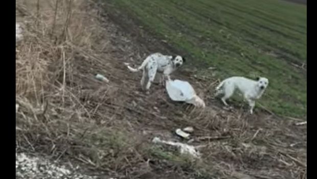 Dva dalmatinca na njivi u ataru Ratkova jedu ostatke uginulih životinja da bi preživeli