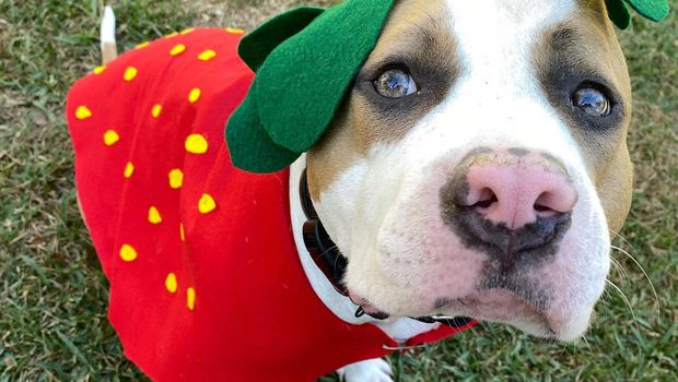 Stroberi (Jagoda) je pas sa prepoznatljivom kvrgom na glavi koja je nastala usled jake fizičke traume, a od sigurne smrti eutanaziranjem spasen je i udomljen zahvaljujući velikom srcu osnivačice Labelle Foundation