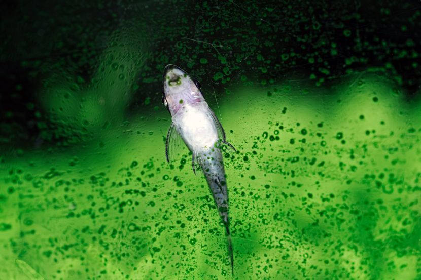 Cvetanje algi: mikroskopske alge koje se ne mogu obrisati ni sastrugati sa stakla. Ni zamena vode nije efikasna, jer se preostale alge brzo razmnožavaju. Blokirajte svetlost u akvarijumu na nekoliko dana i testirajte vodu da biste bili sigurni da ne sadrži amonijak, nitrite, nitrate ili fosfate koji podstiču rast algi. Ultraljubičasto svetlo u sistemu za filtriranje takođe usporava cvetanje algi u vodi.