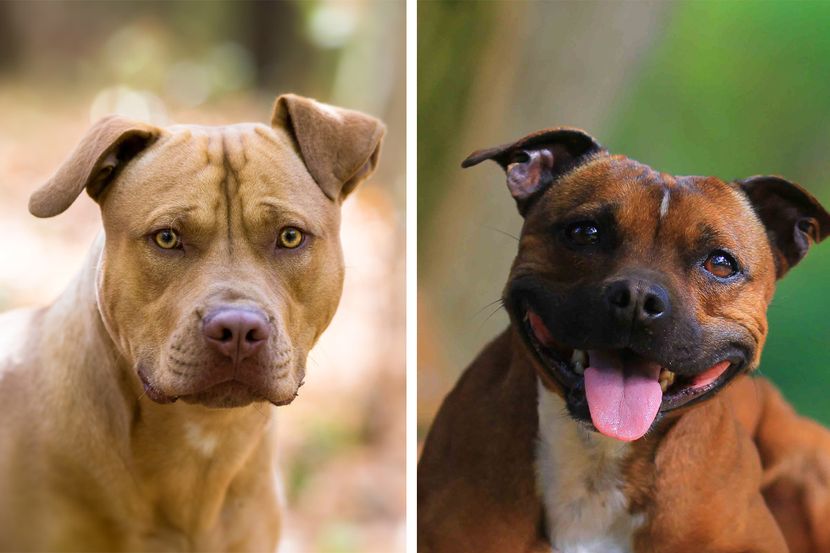 Ako želite višeg atletskog psa, pit bul je bolji izbor, a ako više volite čvrstog, zdepastijeg psećeg pratioca, birajte staforda. Obe rase imaju karakterističnu snažnu, mišićavu građu sa širokim grudima i kratkom, elegantnom dlakom. Međutim, američki pit bul ima dužu njušku, njegove uši se često kupiraju, a ima i primetno uvučen stomak. Stafordski bul terijer je "kockastiji" i kompaktniji, ima kraće i šire lice, poznati široki "osmeh" i dobro definisane mišiće obraza. Njegove uši su prirodne, u obliku ruže.