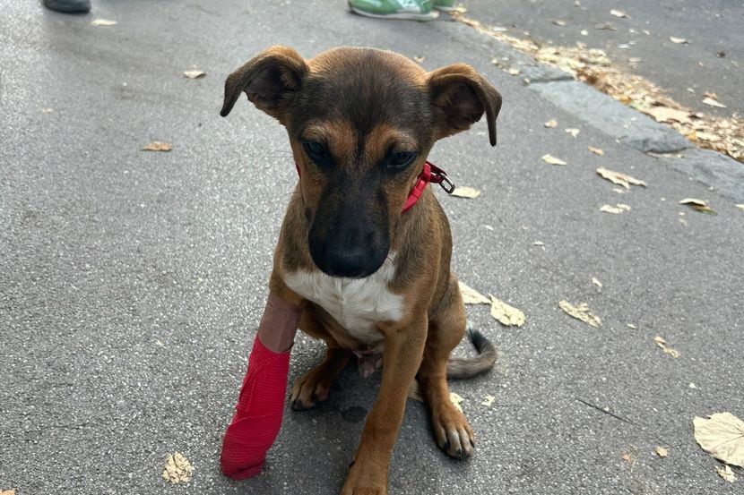 Pas na ulici u Beogradu, sa crvenom ogrlicom i povređenom šapicom umotanom u crvenu tkaninu.