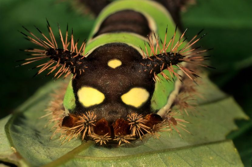 Ova gusenica neonskih boja nalik pužu upozorava potencijalne predatore na svoju otrovnu prirodu. Ona ima specijalne bodlje koje pokrivaju njene brojne dugačke "rogove" na telu. Bodlje su šuplje i ostaju u koži žrtve. Iako su majušne, bodlje su pune iznenađujuće jakog otrova koji izaziva otoke i bol satima ili čak danima nakon ubadanja.