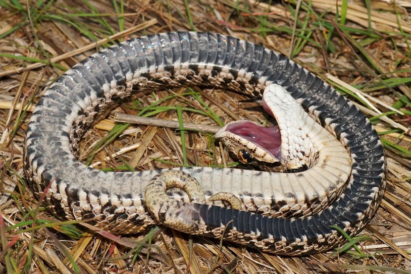 Jedna rečna zmija, poznata pod latinskim nazivom Natrix tessellata, lažira sopstvenu smrt kako bi se odbranila od pretnje ili situacije za koju proceni da je opasna po njen život: ovaj gmizavac, poznat i kao kockasta zmija, maže se krvlju i izmetom kako bi njen "performans" bio ubedljiviji.