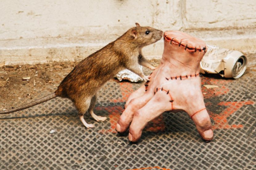 Na snimku pacov Aleksandar pleše i penje se po bestelesnoj ruci iz ovog filmskog ostvarenja, poznatoj kao Stvar (Thing).