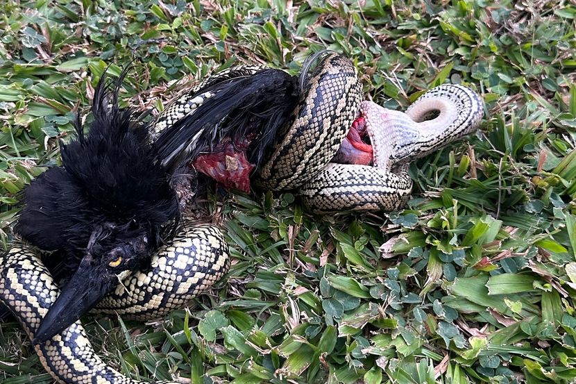 Australijski hvatači zmija iznenadili su se nakon što su pronašli mrežastog pitona kako jede obrok koji nije sam uhvatio! Na fotografiji, kako prenosi au.news.Yahoo, vidi se zmija kako je do pola progutala veliku crnu pticu koju je nekoliko sati ranije usmrtio pas iz dvorišta.