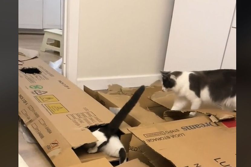 Mladić je u sobu stavio nekoliko velikih kartonskih kutija koje su mačke dočekale sa oduševljenjem. Ova zabava je toliko jeftina da o njoj ne treba diskutovati, a mačke nikad ne mogu da sakriju oduševljenje kad ugledaju kutiju.