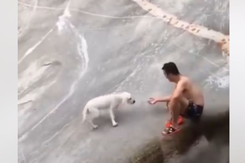 Kad se spustio na opasnu kamenu površinu, čovek je lagano klizio do šteneta, a potom ga uhvatio i spustio se u vodu.