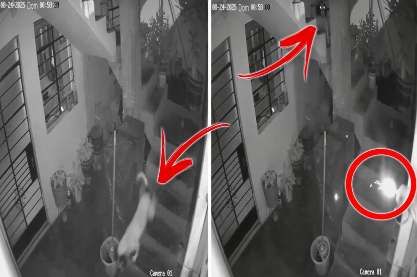 Snimak incidenta pokazuje psa kako laje dok se osoba sa dinamitom približava i ispušta predmet. Pas silazi nekoliko stepenica i grabi dinamit.