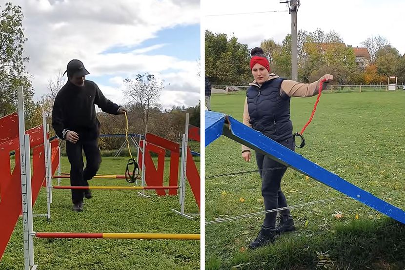 "Hop! Hop! Hop", doziva 65-godišnjakinja dok učesnici preskaču male stubove sa ojačanim povocima. Učesnici "tapšu" vazduh pred nogama, posežući u džepove za zamišljenim poslasticama i govore: "Bravo!"