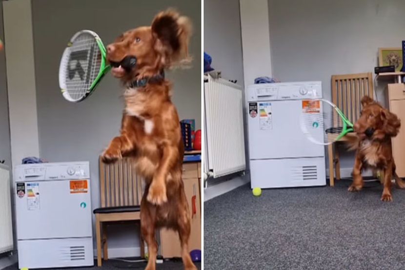 Na društvenim mrežama pojavio se snimak na kom se vidi kako pas uživa dok skakuće i udara loptu reketom koji čvrsto drži u zubima.