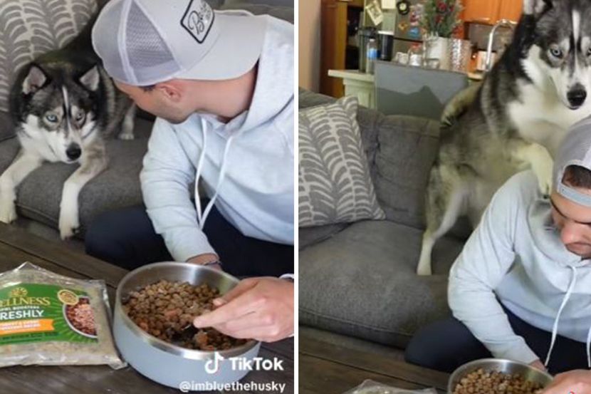 Pogledajte presmešnu reakciju haskija zbog mladića koji se pretvara da jede pseću hranu