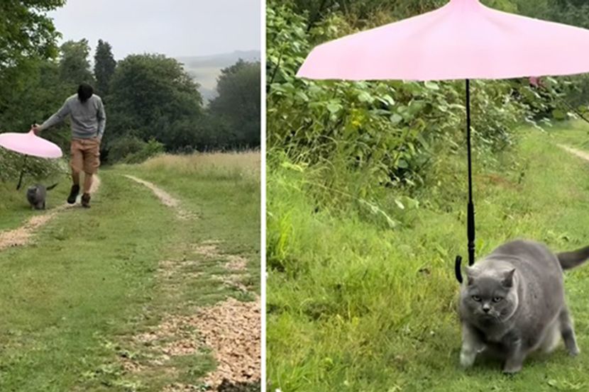 Video koji je nastao tokom jedne njihove šetnje prikazuje vlasnika kako velikim roze kišobranom štiti macu od kiše.