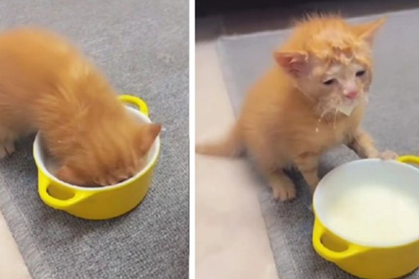 Video od 86 miliona pregleda: Mače toliko voli da pije mleko da je potopilo glavu u činiju