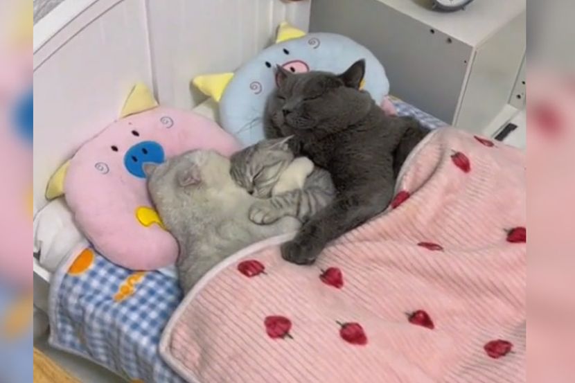 Snimak mame mace, tate mačka i njihove bebe dok zagrljeni zajedno spavaju na krevetiću oduševio je internet, prenosi Index.hr.