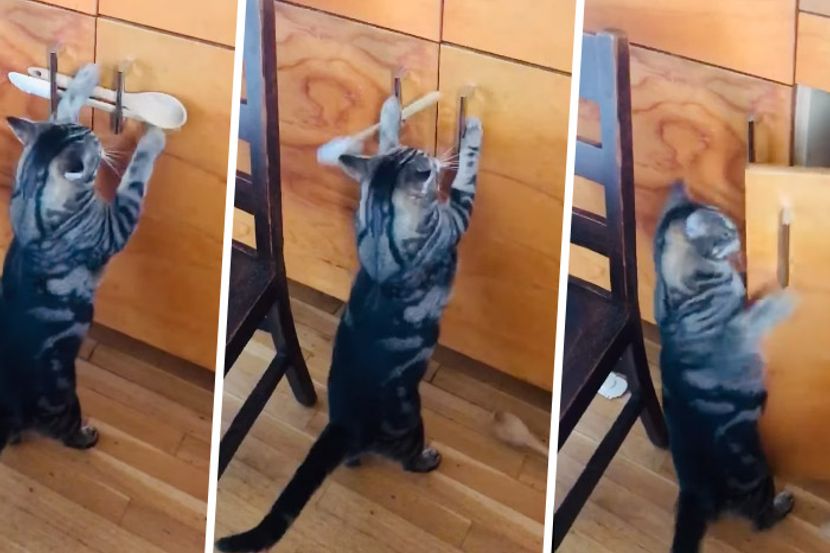 Osmišljeno - učinjeno: na ručke jednog kuhinjskog elementa postavili su dve varjače kako bi onemogućili mačku da otvara policu.