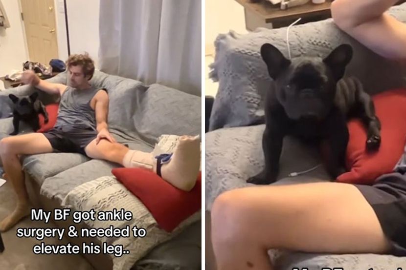 Na snimku se vidi kako vlasnik drži nogu u gipsu na jastuku postavljenom na kauču, prenosi Index.hr.