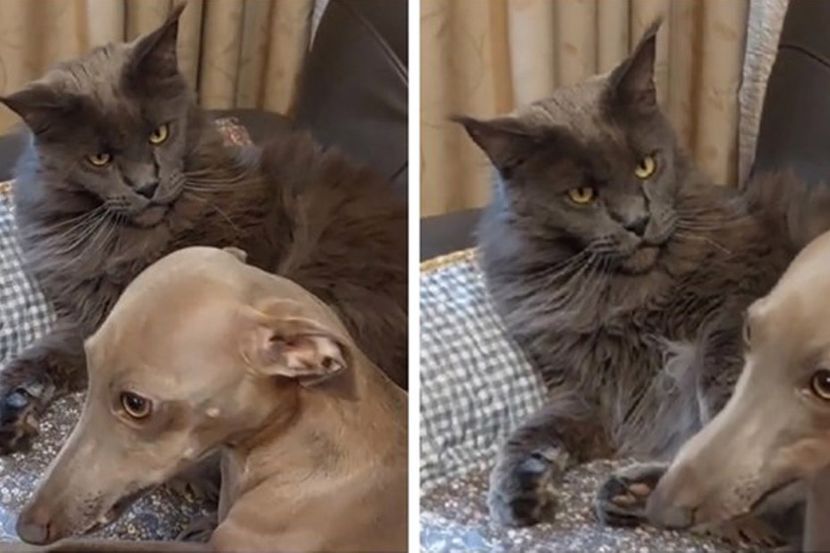 Mačka i pas sede zajedno na kauču, a način na koji mačka gleda uznemirenog kucova nasmejao je mnoge korisnike ove društvene mreže.