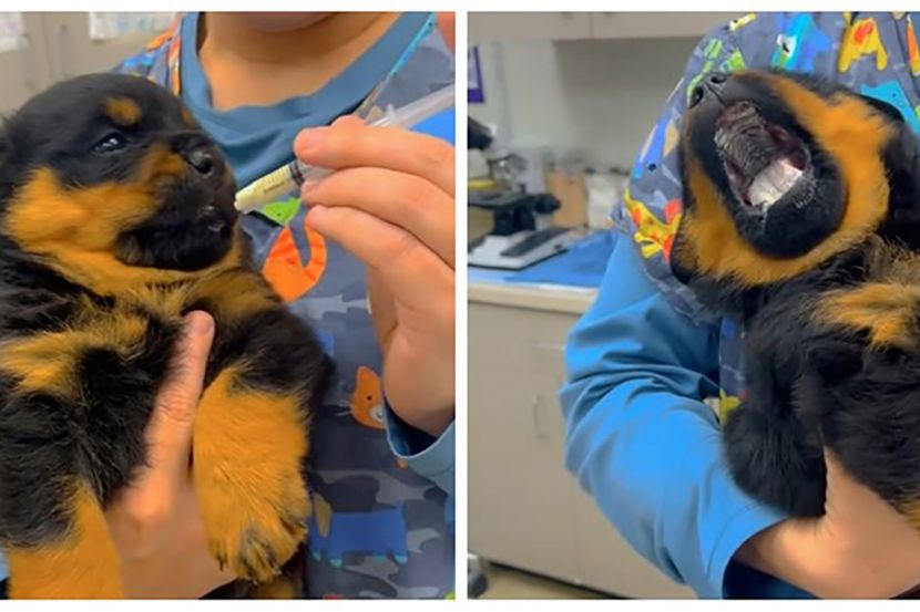 Na snimku je preslatko štene rotvajlera koje odbija da popije svoj lek.