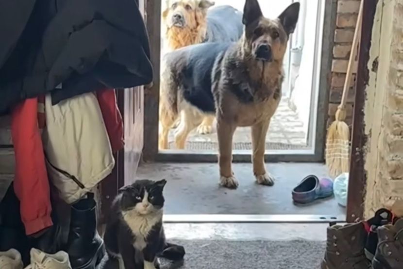 Kućni ljubimci psi - dva nemačka ovčara i jedan mešanac - pokazali su naročitu čast uličnoj mački koju su doveli u svoj dom.