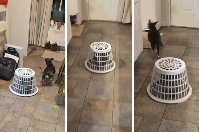 Video ima natpis: „Ovo je mala zaštitna korpa kad on nervira našeg starijeg psa i priđe previše blizu.“