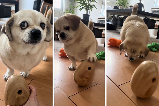 Iako Miki jasno pokazuje da nije oduševljen što mora da se potrudi da dobije hranu, on se začuđujuće brzo usmerava na jaje hranilicu kako bi dobio poslastice. Mešanac mopsa možda pokazuje svoje trenutno raspoloženje, ali i da je veoma pametan.